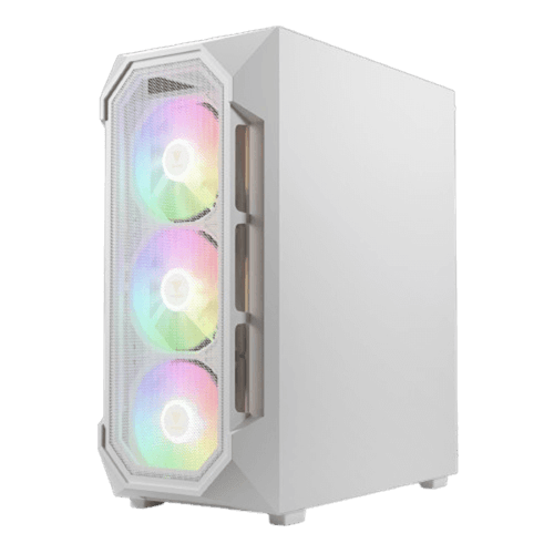 The AURA GC1 ELITE V2 Series, available in snowy white, is an affordable mid-tower case with a sleek and compact design. Featuring a mesh front panel for unhindered airflow, 4 built-in fixed ARGB fans, an improved interior compatibility, and a panoramic tempered glass side panel to show off the beauty of your build.